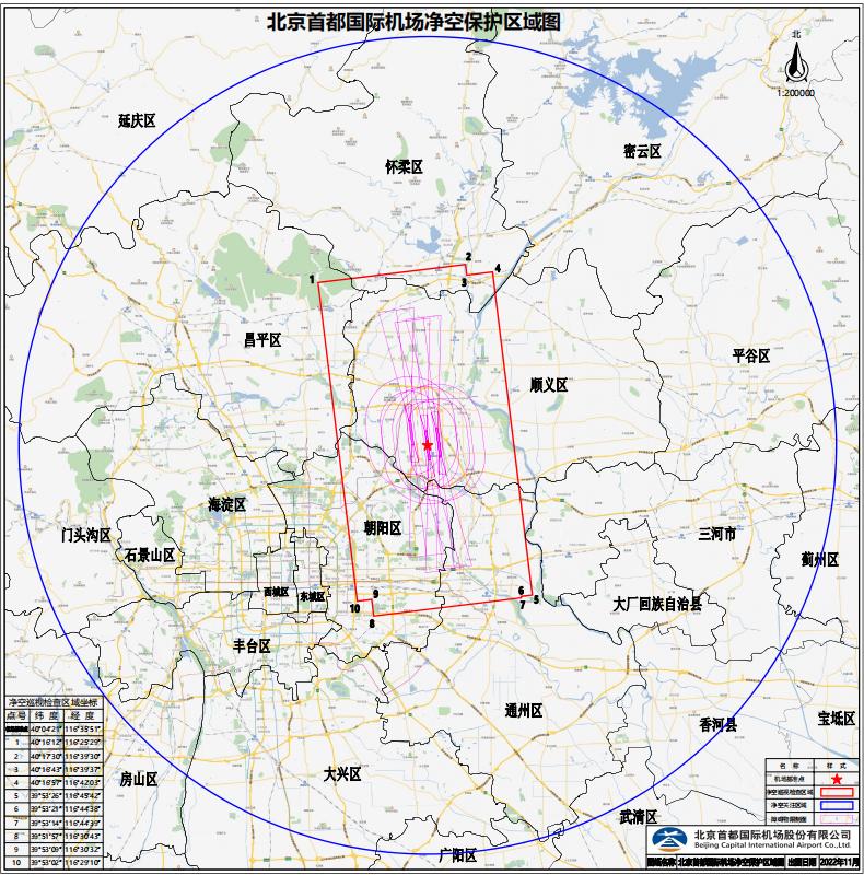 首都機(jī)場(chǎng)凈空重點(diǎn)保護(hù)區(qū)域(凈空巡視檢查區(qū)域)范圍為首都機(jī)場(chǎng)跑道中心線兩側(cè)各10公里、跑道端外各20公里以內(nèi)的區(qū)域,涉及順義區(qū)、朝陽(yáng)區(qū)、通州區(qū)、昌平區(qū)及懷柔區(qū)部分區(qū)域,總面積約1050平方公里。