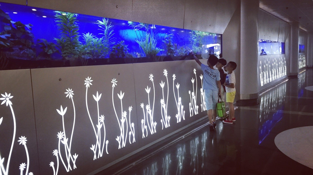 T2連廊口設(shè)置了集“水族觀賞、合影留念、投影互動(dòng)”于一體的T2“海底世界”景觀走廊,新加入的投影互動(dòng)系統(tǒng),將T2“海底世界”的動(dòng)態(tài)影像投影于地面,在紅外系統(tǒng)的監(jiān)控下,旅客腳步踩過(guò)“水面”,游魚(yú)會(huì)“匆匆”游走,不經(jīng)意間的高科技互動(dòng)體驗(yàn),為旅客帶來(lái)了意外的歡樂(lè)。