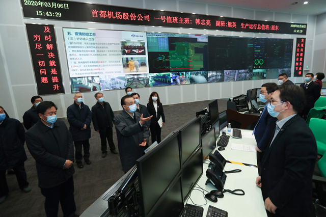 在機(jī)場運(yùn)行控制中心,李克強(qiáng)聽取疫情發(fā)生以來全國航班運(yùn)行、人員出入境、貨物進(jìn)出港等情況匯報(bào),對民航系統(tǒng)保障醫(yī)務(wù)人員和抗疫物資運(yùn)輸、開通點(diǎn)對點(diǎn)航班幫助重點(diǎn)行業(yè)農(nóng)民工返崗復(fù)工表示贊許。
