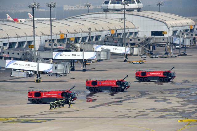 壯觀絢麗的三道水門看似并不復(fù)雜,卻絕非“大力出奇跡”的簡單操作。參保人員先后數(shù)十次利用747實體訓(xùn)練飛機開展訓(xùn)練,從車輛點位確定到射水時間把控,從依據(jù)風(fēng)向調(diào)整水炮方向到兩車進行水流對接,每一個細節(jié)都需要反復(fù)琢磨。同時,為使水門能夠保持較長的時間,保障組人員精密測算,確定了現(xiàn)場車輛距離條件下形成水門的最小射流,既能保證水門的完美形態(tài),又能將時間控制地精準(zhǔn)。